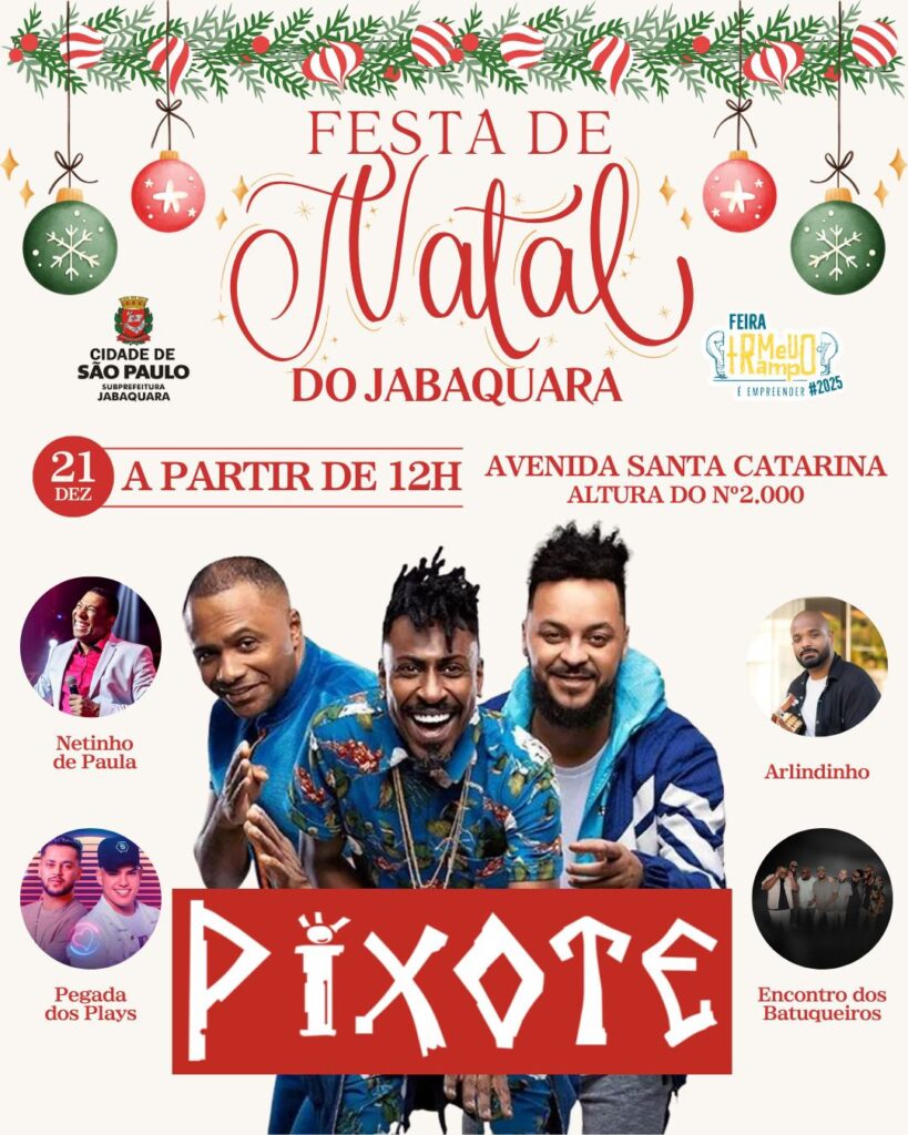 A região do Jabaquara recebe no dia 21 de dezembro, a partir das 12h, a Festa de Natal do Jabaquara, com programação gratuita voltada para toda a família. O evento acontece na Avenida Santa Catarina, na altura do número 2.000, e reúne atrações musicais, atividades culturais e feira de empreendedorismo.