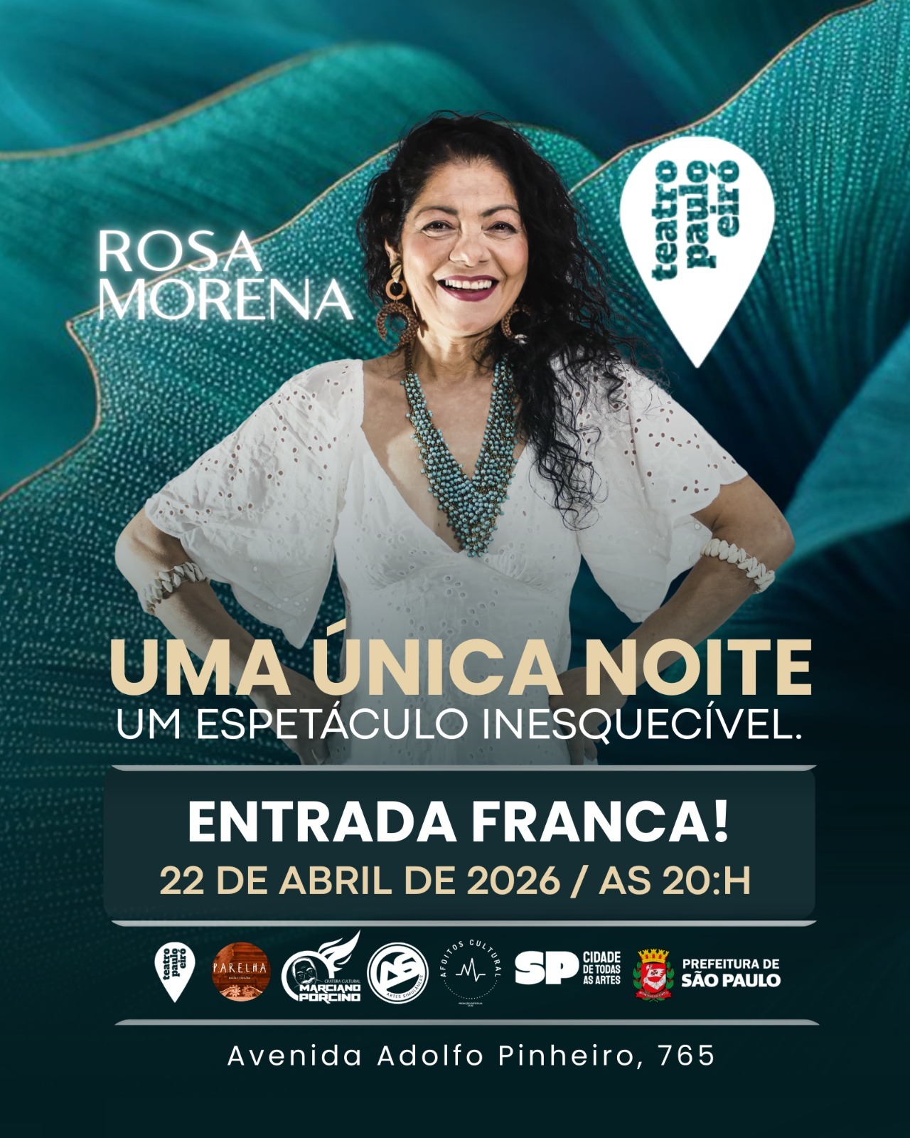 São Paulo, 14 abril de 2026 – A cantora, compositora e atriz Rosa Morena, uma das vozes mais representativas do samba paulistano, sobe ao palco do Teatro Paulo Eiró no dia 22 de abril de 2026 com o espetáculo “Resplandecer: Rosa Morena canta Clara Nunes”. A apresentação é gratuita e convida o público para uma noite de emoção, memória e celebração da cultura brasileira.